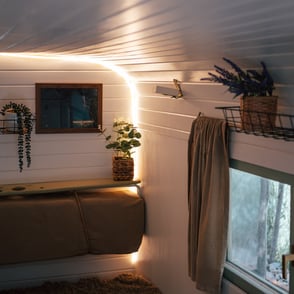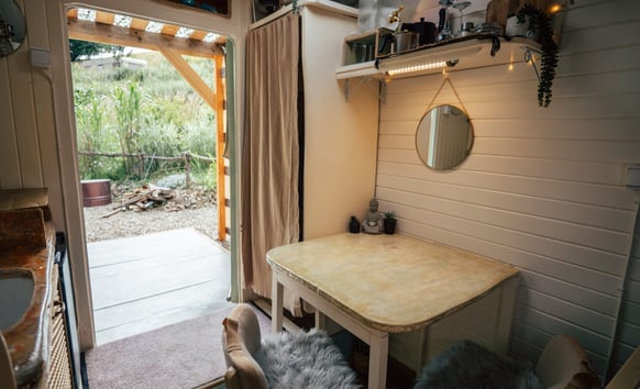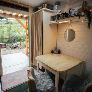 Nájdeš tu murphyho sklopnú posteľ, ktorú cez deň môžeš zdvihnúť. Takisto jedálenský stôl je sklopný, aj kuchynka a malý stolík na laptop či extra pracovnú plochu. Tak si môžeš upravovať priestor v Lesanke podľa toho, ako Ti to vyhovuje.
