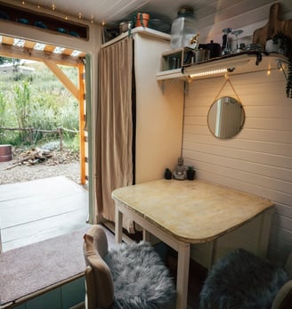 Skvelý únik za hranice všedných dní Ťa čaká v LESANKE - šarmantnej maringotke, ktorá vďaka svojej verzatilite denného a nočného režimu, ponúka všetko potrebné pre pohodlie a romantiku.
